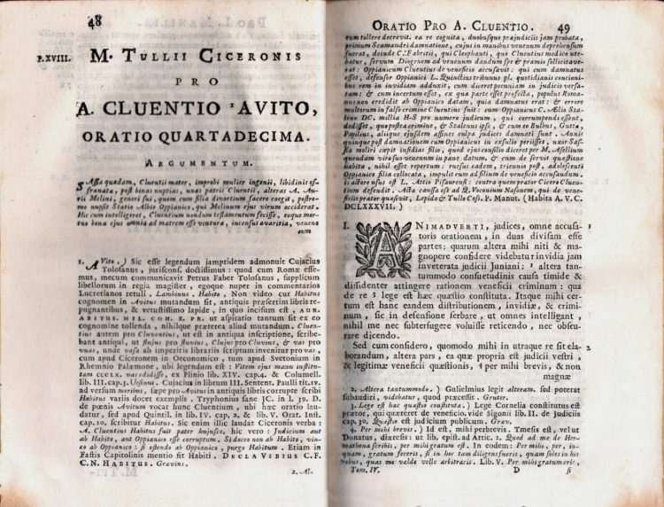 L’arringa in difesa del larinense Aulo Cluentio Habito è una delle più lunghe e complesse orazioni pervenuteci e verosimilmente non fu pronunziata in una unica udienza; si ritiene, inoltre, che essa sia stata in un primo momento appuntata e che solo più tardi l’autore abbia rivisto il testo prima della diffusione.