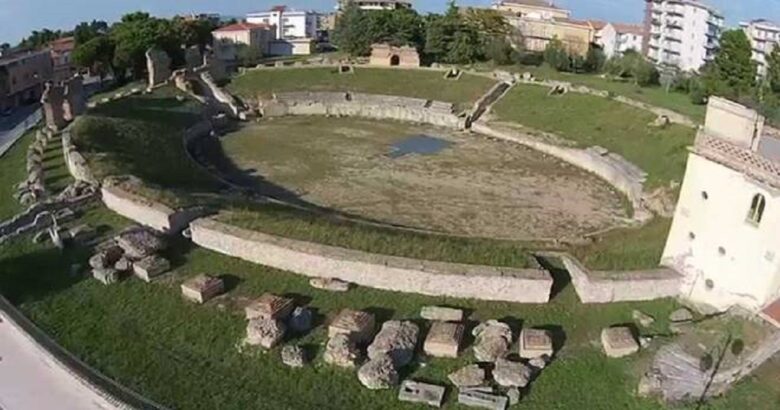 La costruzione dell’Anfiteatro, come è noto, è degli anni compresi tra l’80 ed il 150 d.C., durante la dinastia dei Flavi, a struttura mista, in parte costituita da strutture murarie sopraelevate nel tufo: la sua forma è ellittica, con quattro porte di cui, quella Nord è detta “ Porta dei Gladiatori, che consentiva l’accesso del corteo che prevedeva i giochi e l’entrata e uscita dei gladiatori vincenti. La porta Sud quella dei vinti. Le porte ovest ed est erano riservate all’accesso ed uscita degli spettatori che venivano anche dai paesi vicini.